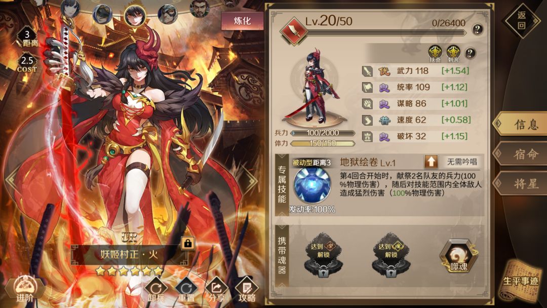 各位主公,欢迎来到《全战天下》的世界。上次给大家介绍了作为一个开放式策略游戏的主要玩法内容。 这次来给大家介绍游戏中最核心的英灵系统内容。请大家先睹为快~ 英灵系统界面 在《全战天下》中,英灵包含多种属性元素,这些元素成为战斗策略的重要组成部分。 距离:代表此此英灵的攻击距离。 cost:代表将此英灵配置到部队中时,需要消耗的cost点数。 进阶:当具有个相同英灵时,可以进阶来提升属性。 炼化:每