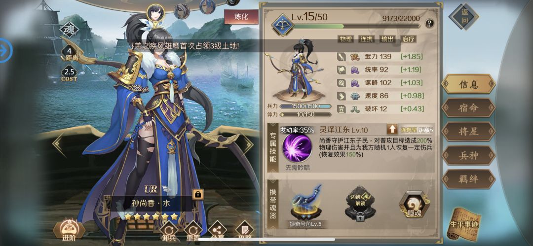 孙尚香-水 该英雄作为签到就能得到的英雄,获得门槛低,谁都可以拥有,试问谁不喜欢? 并且她的技能“灵泽江东”既有输出也有恢复,对于新手玩家,开荒损失低,非常适合前期使用。 最重要的是,可以方便的和非常容易获得的水大桥,水姜维进行组队。三个英雄只需要 7.5 就可以闯荡天下啦!简直新手福音。 当你在纠结缺这个缺那个的时候,这三个英雄已经可以组队为你的前期带来非常不错的收益。 在魂器选择上,首推振奋号