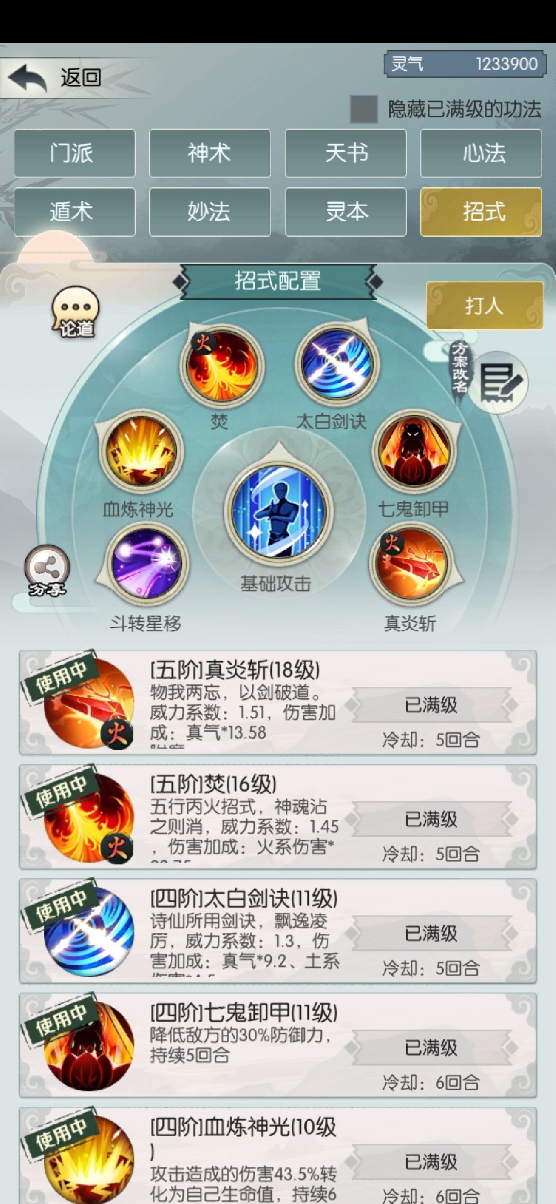 化圣有一段时间了本来不想写攻略了的,但还是稍微写一下吧,真气化圣,不依靠身法那些招式的话首先 第一.你得体魄过1.6亿左右 第二.弄到一本会心 第三.真气过250左右,主五也一样 第四.元神兽 点数最好能点到后发,没有点剑右 以上条件1 2 3是刚需, 接下来说说怎么打 有两个方法,一个是剑右的 方法一, 招式向上面这样 兽技能必要会心,其他有力透带力透其余吸血 招式讲解,我们是三输出,主输出放最