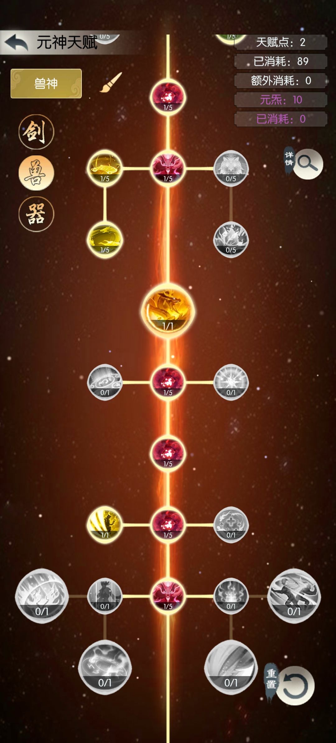 第一种就是兽天赋开右边,满足直接开启第五个招式加第六回合使出灵兽招式如图所示: 因为我天赋点不足没有开启,这个适合大多数人,天赋点到了直接带会心一击,当然三星会心是最好的,给第五招式,第六回合就会直接触发,剑带方圆,抗五轮伤害运气好闪了几次能多叠加伤害 灵兽招式就带这些,有闪的带闪,最好带百分之五十以上的招式,触发效果会更好! 第二种就是我偷过的这种,前期天赋点不够直接开剑右,来增加攻击伤害还能偷