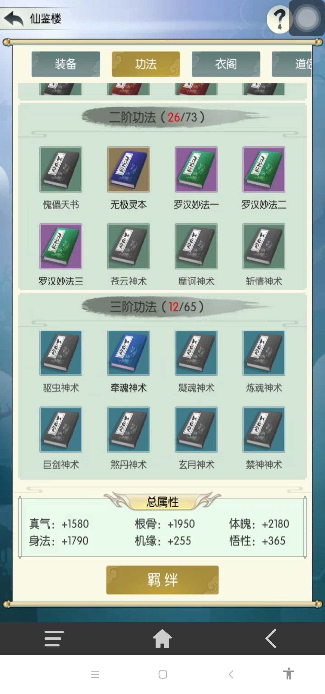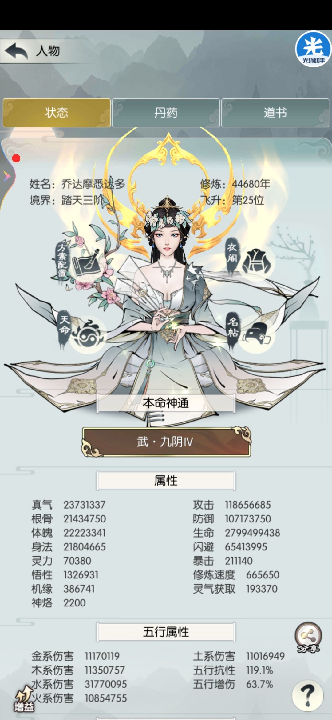 第二关扫荡了这么久,今天突发奇想换了一下招式,没想到直接5次机会通了四关,剩下一关明天应该问题不大,主要核心思路就是剑右剑破万法清buff,实际两输出就够用,看了其他大佬的攻略,除了主五通关的时候比我低点,其他属性都是碾压,事实证明只要主五高就完事了,各位道友可以尝试更低主五通关。减伤女娲两件拉满,心魔减伤拉满。四幻境我的是阳,实。神通九阴,剑胎玄鱼具体配置如下。
