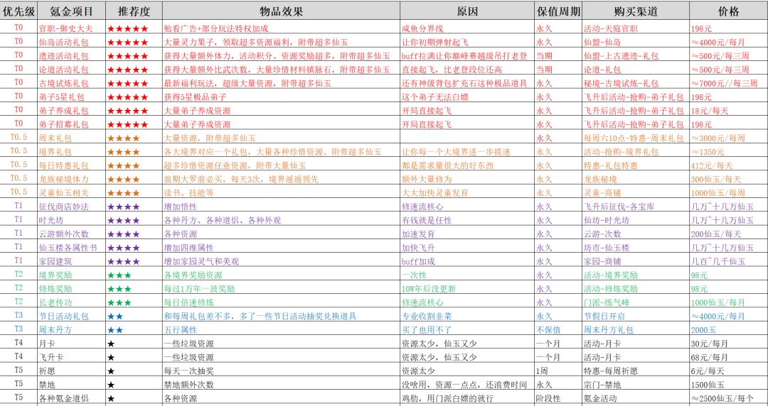 (本攻略由紫霄-鸾半凡撰写,紫霄-上杉绘梨衣、偷菜摸鱼小妖怪、鬼厉、kk辅助编写审核完成;由于总体字数较多,将拆分为四篇发布;可以随意借鉴随意转载。) 氪金篇(谨慎参考) 氪服困难,重在陪伴;提供思路,意在避坑;坚守道心,忘我无我。 活动性价比:春节>正常节日&版本活动>周末>每日 现金或仙途币购买部分 首先充值不充仙玉,只充仙途币,就是图方便,而且直充仙玉的收益较差。优先各档位仙途币首充,10%