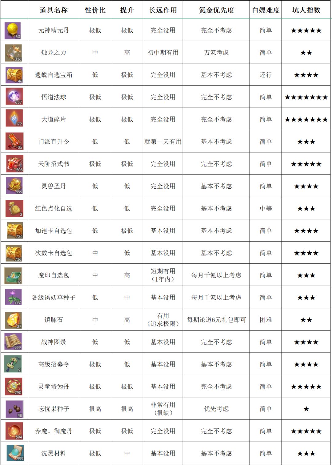 买了这些,熬到后期与氪佬没啥本质区别 开局推荐选择孤儿学技能,想要冲榜选择寒门 七日必买 1 五转圣功 2 灵力丹 3 想要全收集的可以再买下妙法灵本还有丹方,没啥用,但属于绝版,可以拿来收藏 境界礼包必买 68元分神期礼包,有技能,技能越多后期玩法越丰富 仙册必买 1 第一次仙册不存在必买选项 2 第二次仙册不存在必买选项 3 第三次有个灵池加速卡,可以在拥有一定灵气获取速度的基础上把灵池从20