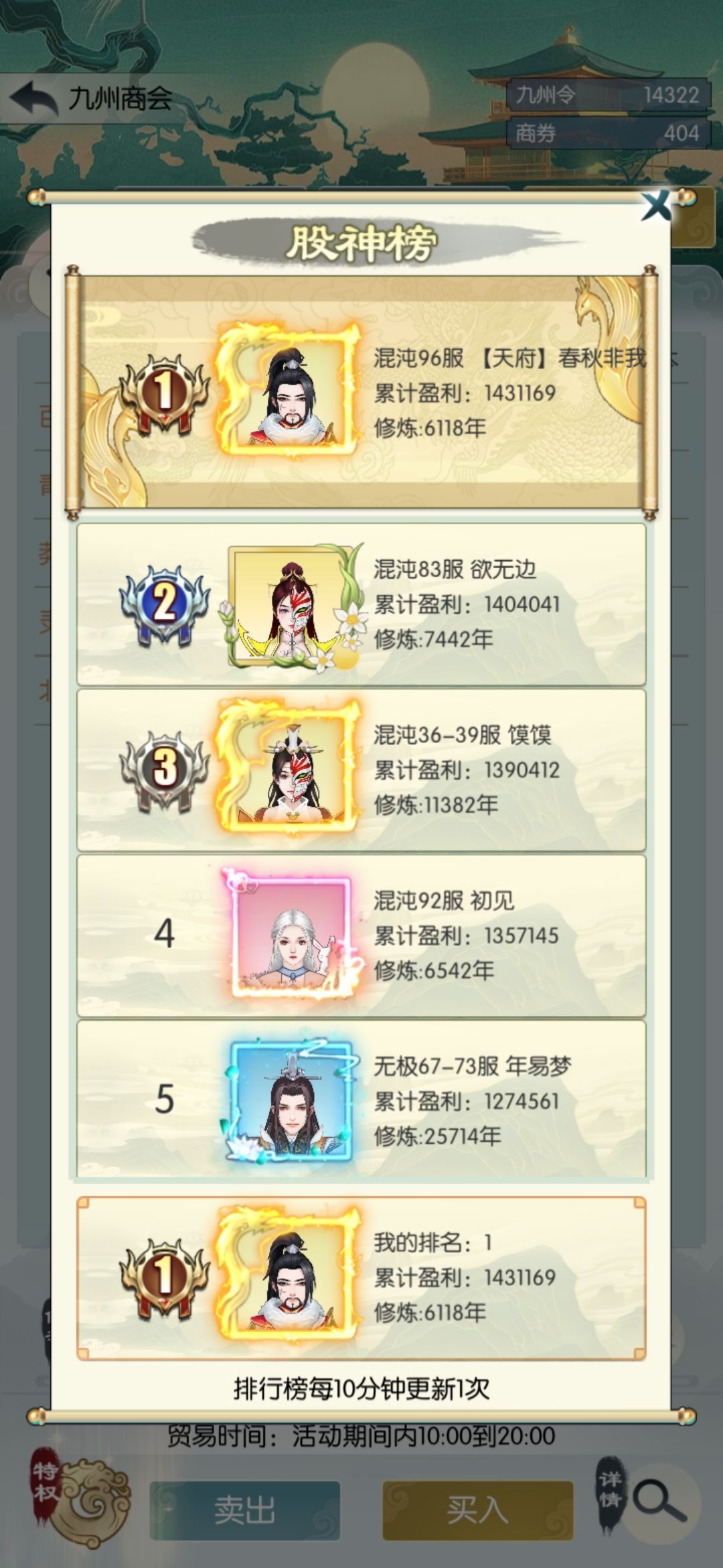 刚出炉的排行榜镇楼hhh 首先我的九州操作基本都是参照https://www.taptap.com/topic/16921746里,赫连大佬的攻略来的。虽然赫连大佬的那张图的涨跌计算有点问题,但整体操作基本完美,而且最后的收益也差不多,所以那张图可以保存下来进行参考。 另外有几个小tips道友们可以参考一下,弄好了一周多几千九州令换东西爽歪歪。 1. 前两天,基本按照大佬的攻略走,选高星股票,中午