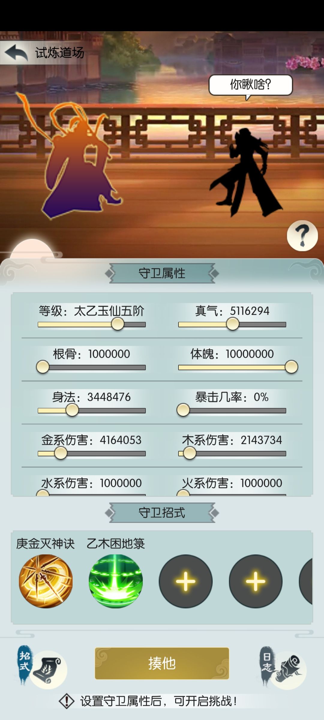 以玄仙技能为例 伤害公式=(攻击力*威力系数+五行伤害*伤害加成*(1-五行抗性)-防御力)*(1-境界压制-九阴减伤) 好了,去门派实验 根据计算,庚金的伤害为46074408,乙木的伤害为21589289 完美,一点不差下面是我的属性 感谢暗神丶陌心大哥在公式总结过程中的耐心支持