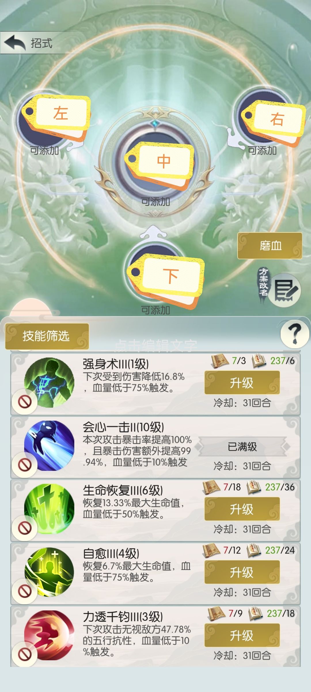 仅面向新手,属于开局教学攻略 开局3个浑源丹 传功到筑基1 两个三阶招式 进第一关找第一个祭坛 如果有表里如一,就全买根骨丹 没有表里如一,就5根骨1体魄的买 前期词缀选择 痛击永远的神(伤害的主要来源,前期伤害不够就是因为没痛击) 痛击>乱舞>体术>胆怯(两根骨词条前期碰到就拿,其他词条优先拿没有的,先凑齐15个) 后期词缀 1阶:乱舞,痛击 3阶:表里3,荆甲3,壁垒2 4阶:天书2,坚甲2,