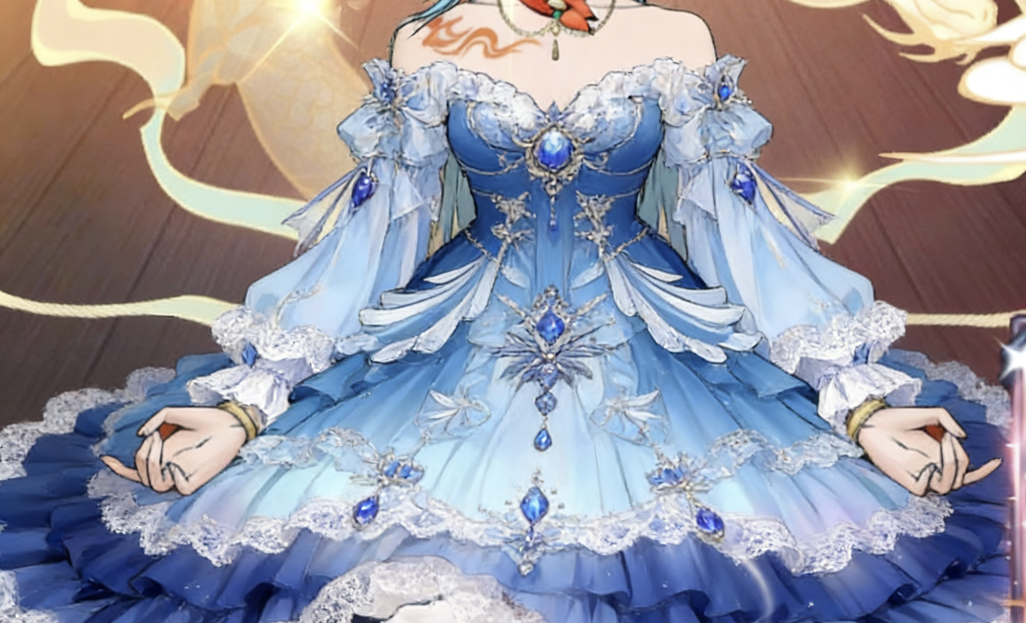 整体采用蓝黑配色,手中配有蓝白色扇子等
