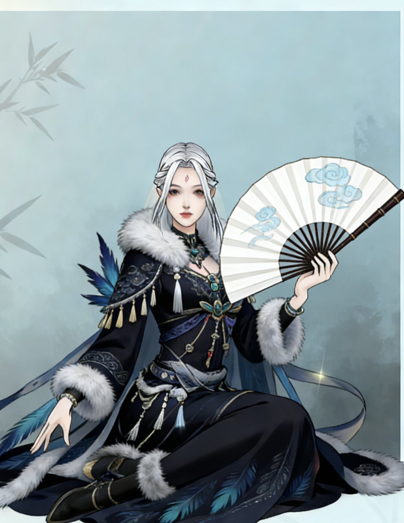 整体采用蓝黑配色,手中配有蓝白色扇子等
