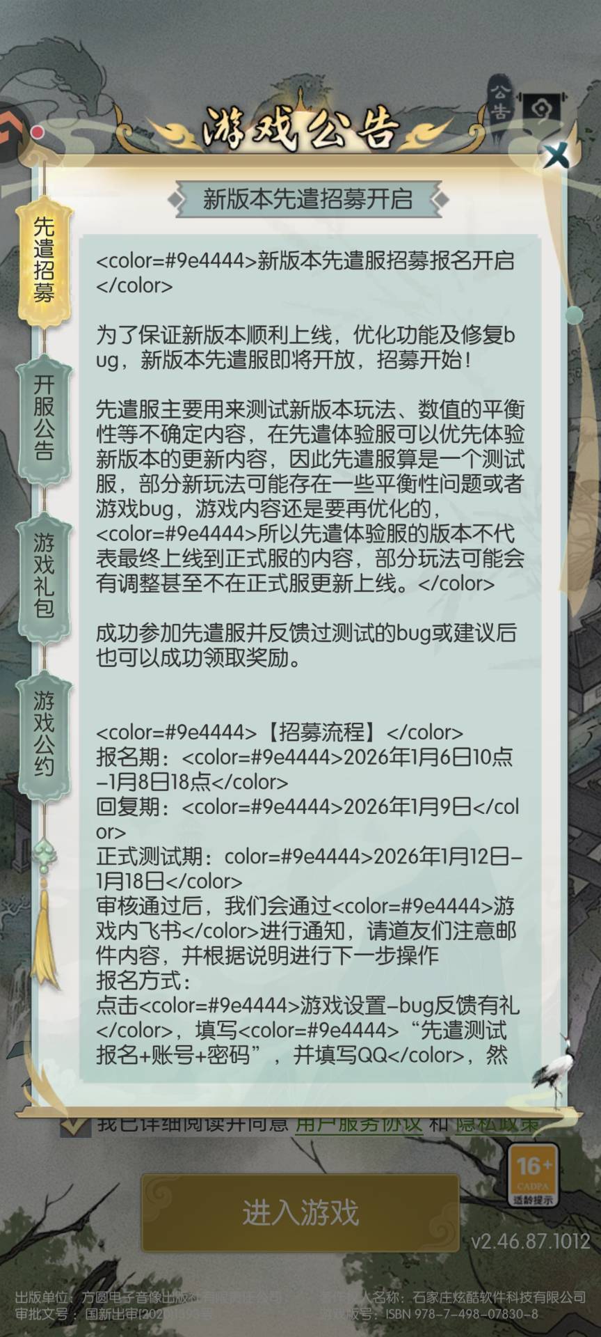 亲爱的道友们,大家好呀,为了更好的完善我们的游戏新版本更新内容,提前了解各位道友对于新版本玩法天地量劫的建议,保证我们新版本顺利上线,先遣服即将开放!本次先遣服的招募范围与以往一致,官服和渠道的道友都可以参与到先遣服的测试当中来,还请大家仔细阅读以下的报名规则哦。①先遣服简介先遣服主要用来测试新版本玩法、数值的平衡性等不确定内容,在先遣体验服可以优先体验新版本的更新内容,因此先遣服算是一个