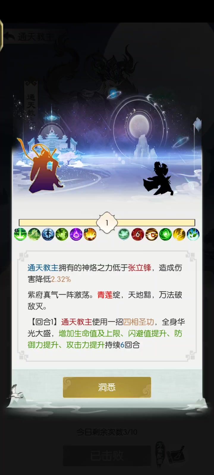 关键的关键是能否在第八回合稳住血线,青莲每两回合扣18e,加上反伤招式,光咱们的血量是肯定不够的,因此得靠回血和吸血来见招拆招。 1、带上灵兽双回血,扛住第1回合的18e, 2、残血开启土莲效果:回血加3回合机制免死,抗过第3、第5回合, 3、依靠吸血再次恢复到80%血量,能扛住第7轮的18e, 4、后发10%主五的灵兽招式增伤,让我们依靠副五也能打出伤害,回够第9回合的18e,并在第10回合击杀