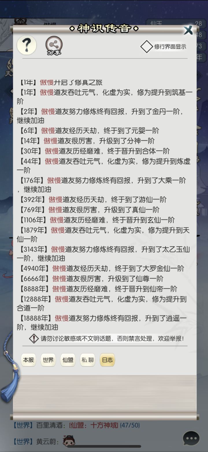 从一万年到两万年,是提升巨大的阶段,从仙帝到逍遥,也是解锁镇魔副本玩法了。过莲花,斩银灵子,可惜止步女魃十。期间离不开自己的努力,当然奕剑小家群里大佬些的指点也至关重要,群里的攻略也很关键,欢迎大家加入奕剑。最后,希望三万年的自己还能活着。