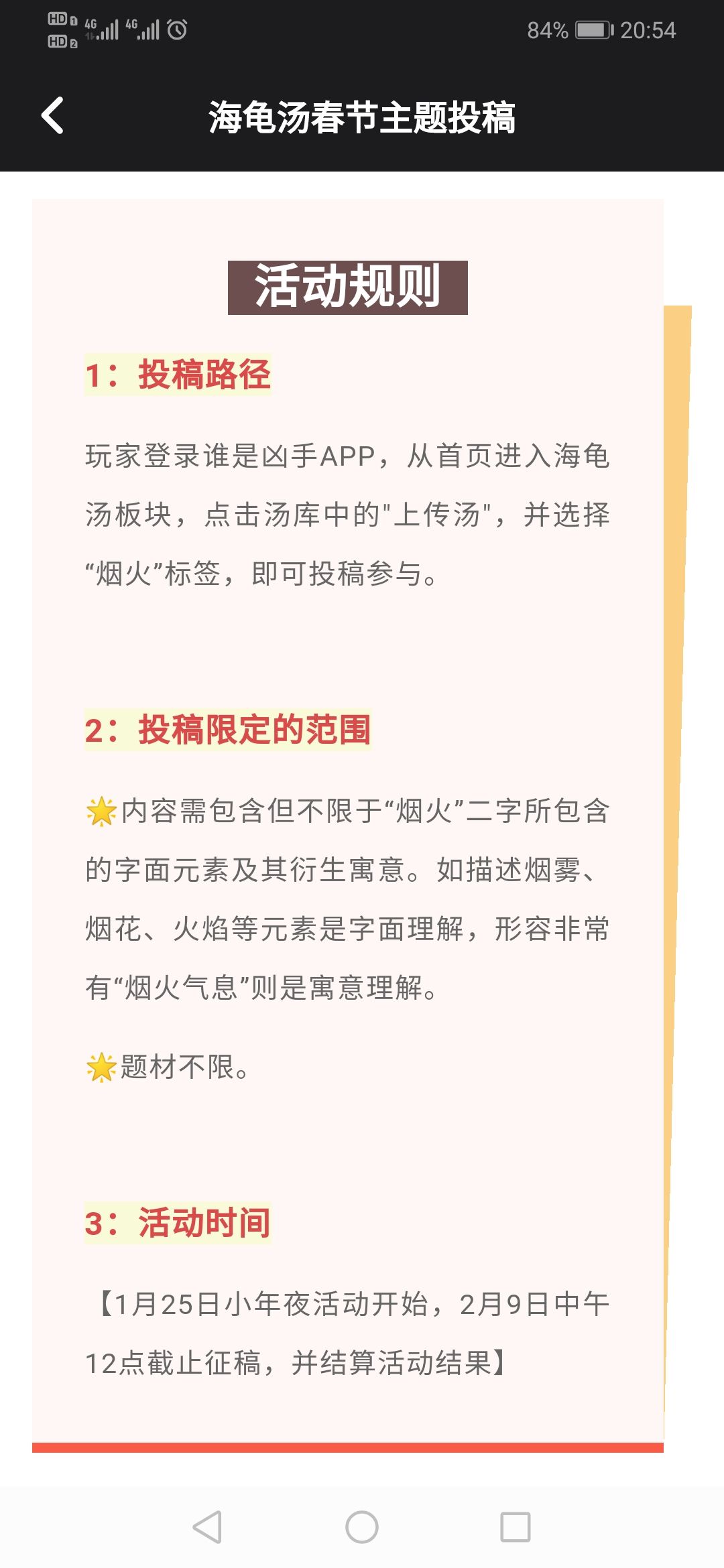 奖励除了绝版头像框还有神秘礼物噢👀 活动规则 1:投稿路径 玩家登录谁是凶手APP,从首页进入海龟汤板块,点击汤库中的".上传汤",并选择“烟火”标签,即可投稿参与。 2:投稿限定的范围 内容需包含但不限于“烟火”二字所包含的字面元素及其衍生寓意。如描述烟雾、烟花、火焰等元素是字面理解,形容非常有“烟火气息"则是寓意理解。 *题材不限。 3:活动时间 [1月25日小年夜活动开始,2月9日中午12点