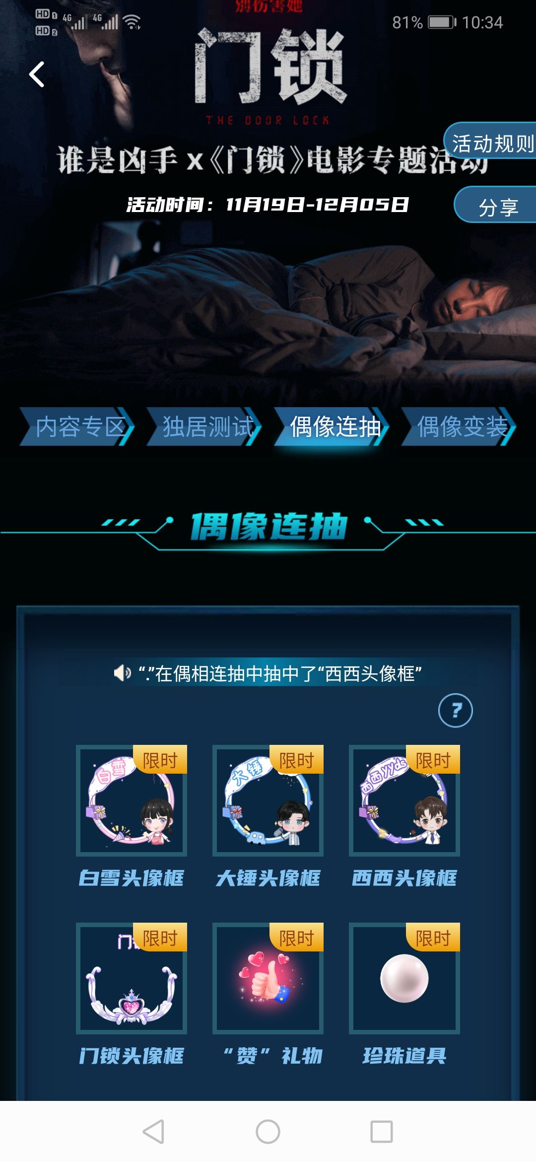 最近联名的电影《门锁》上映啦,然后系统也有推出新活动,小萌新们别忘了每天有一个免费的抽奖活动噢 而且,全部头像集齐后,还有探长全网公布噢🎉 快去抽奖吧(≧∇≦)~