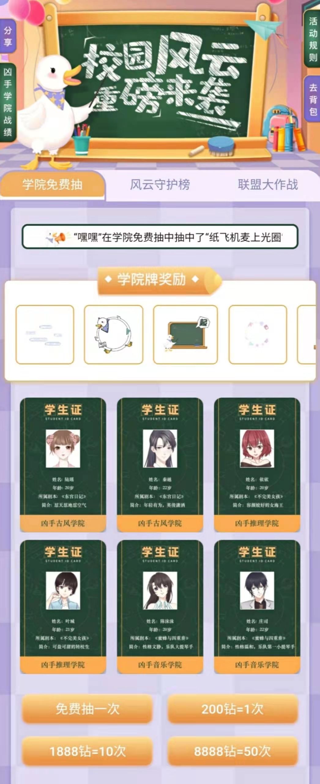 校园风云 ,重磅来袭 凶手推理学院~ 加油鸭装扮套餐 ~ 送礼物随机爆绝美稀有戒指 9月9日-9月13日 快来一起赢得装扮套装吧~