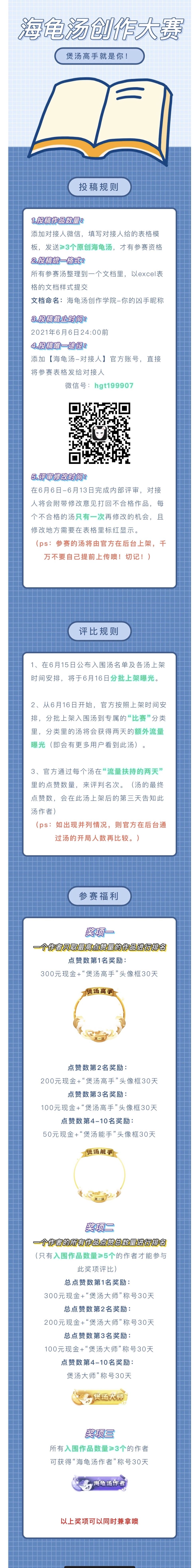 活动主题: 黄庙村联名海龟汤体验打卡。 活动奖励: 选取15篇走心的游戏评价或帖子,送出腾讯视频会员。 活动时间:2021.8.20日——2021.8.29日23:59截止。 参与方式: 添加官方负责人微信:haiyoushui-1,了解具体要求~ 在官方指定平台的游戏评价区或论坛中,发布玩联名海龟汤的游戏评价或帖子。并截图+附上游戏uid发送给官方负责人微信。 注意事项: 1、先添加官方负责人微