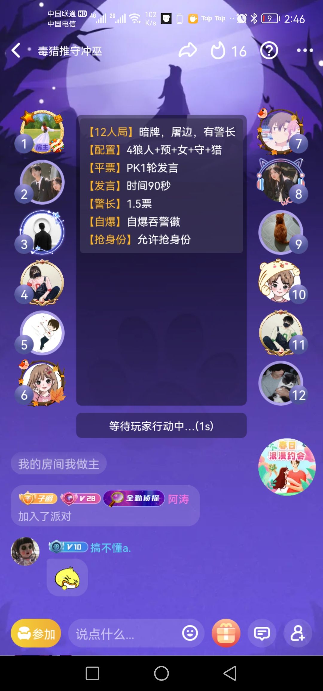 玩了半年多的一个狼人杀心得 ,想给你们大家分享分享,想让你们一起来学习学习。 这是12人狼人杀的板子,预女猎守,我当狼时总是很慌,支支吾吾不敢说话,总划水,后来也向老玩家们那里吸取了许多经验,我相信我可以玩得更好。 那么我来分享一下一些比较质量的玩家@蓝胖胖、@焦大郎、@陈年、@大厉子、@夜笙、@三分钟的微笑、@侍一大聪明。这些人都很厉害,建议萌新跟他们学着玩,他们各有各的长处。当然,资历比较深的