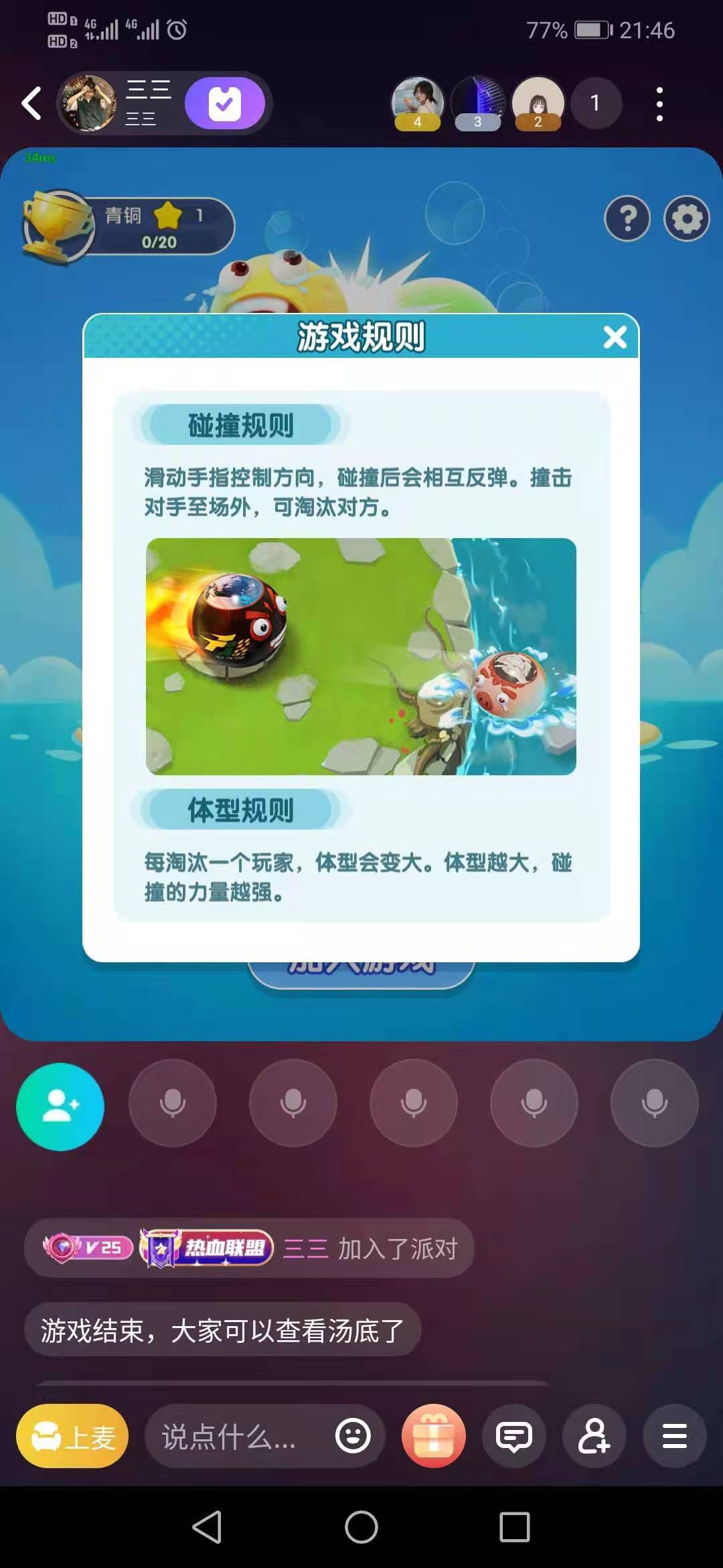 小游戏-碰碰我最强 又是小游戏推荐 碰撞规则: 滑动手指控制方向,碰撞后会互相反弹。碰撞对手至场外,可淘汰对方 体型规则: 每淘汰一个玩家,体型会变大。体型越大,碰撞的力量越强 段位规则 1.段位分为:青铜、白银、黄金、铂金、钻石、星耀、王者(每层10个星级)。 2.参与人数越多,排名越高,获得的奖杯就越多。逃跑奖杯+0。 3.每日最多获得120奖杯。