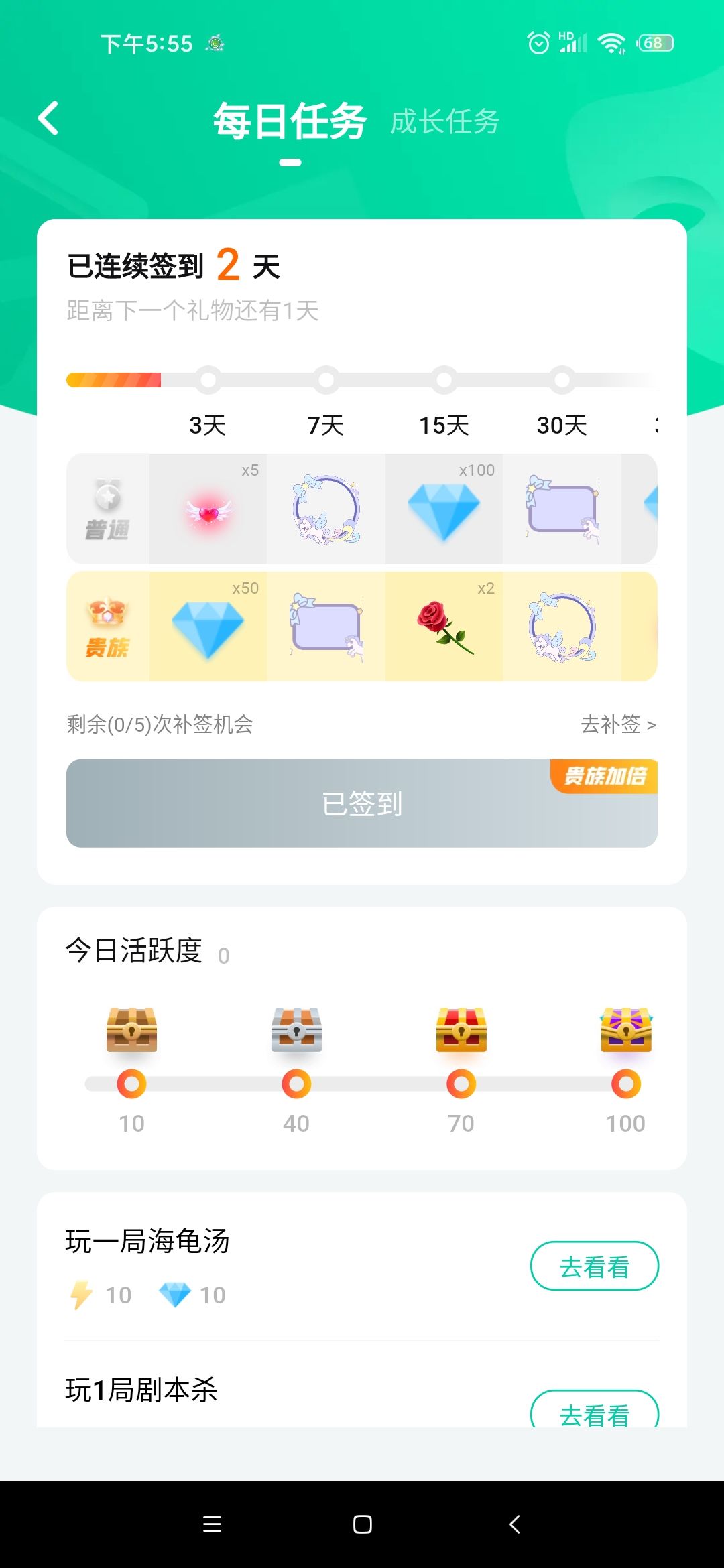每日任务 系统更新后。每天的任务,只要完成了一个点了领取之后,它就会自动往下排序。看似很简单,但是给了玩家非常大的便利。 至少做完任务领钻的时候不用一直往下滑。而且也不用找到底哪些任务做了哪些没做。直接点开,最上面的肯定都是没做的了🤣 咱们的小萌新来了游戏后,签到的每日任务跟成就任务一定要记得做哈~这也是攒钻的好途径~