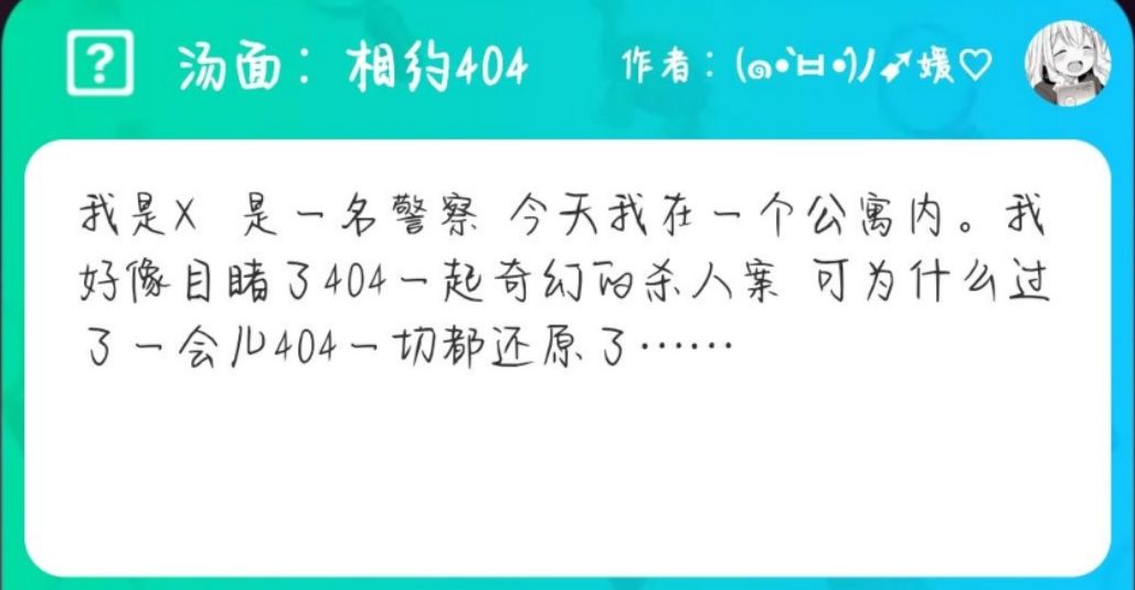 海龟汤攻略: 今天给大家介绍一下海龟汤。 海龟汤是一个由多人组成的游戏。类似于猜灯谜。根据谜面猜出谜底。 可以问主持问题,他只会回答我们是或不是。 想要猜出汤底需要缜密的思维。 前期可以慢慢问几个问题。 一般可以问有人死了吗? 有第三者吗? 这些都是海龟汤通用的问题。 比如这个汤《相约404》 汤面:我是X,我是一名警察。今天我一个人在公寓内。我好像目睹了404一奇幻的杀人案。 可为什么过了一会儿404一切还原了。 游戏开始。 有人死了吗? 是 有第三者吗? 是 404的人和我有关系吗? 不重要 今天就介绍到这里,想了解更多可以下载谁是凶手APP里面有超多剧情和很多精彩的海龟汤等着你。