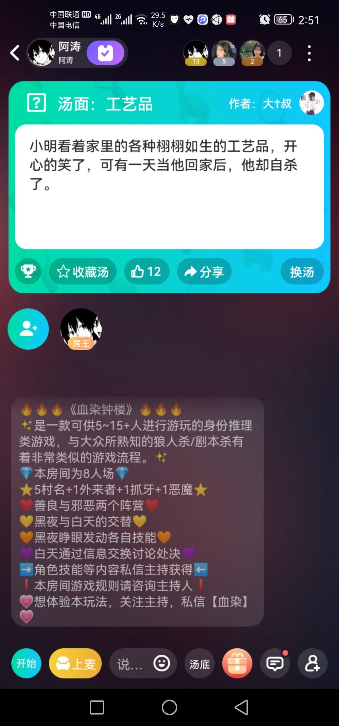 今天分享一个入门的汤,这个汤比较适合新手。 汤面:女明星 女明星养了一个女儿,从小她都会时不时给她的女儿戴一顶帽子,有一天她带她女儿去医院,女儿在医院知道真相后就自杀了。 需要你们问我问题,然后我会回答你“是”“不是”“不重要”,然后通过你们的线索拼凑故事的真相,大家一起来还原吧! 游戏开始 问:女明星毁过容? 答:是 问:给她戴帽子是测量她的头跟自己是不是一样? 答:是 问:女明星把她的容貌给了自己 答:是也不是 …… 本汤是比较通俗易懂的,女明星为了满足自己的虚荣心,觉得自己的容貌不如女儿,便对女儿起来杀心………… 快来下载谁是凶手,跟我一起探寻事情的真相。
