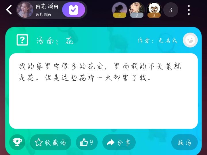 海龟汤推荐:花 今天受朋友推荐,我点开了这个汤,汤面平平无奇汤底大吃一惊,离谱中又透着那么一丝合理😂 介绍一下汤面叭~ 我的家里有很多的花盆,里面栽的不是菜就是花,但是这些花那一天却害了我。 介绍一下海龟汤玩法叭~ 海龟汤是一个情景还原类的游戏 玩法为玩家向房主提出问题,房主根据汤底用是,不是,是也不是,不重要,回答玩家的问题,最后玩家可根据“是”的线索编制出汤底 那么现在问题来了,花有问题吗?花盆有问题吗?花怎么害了我的? 想知道这些问题的答案嘛~ 来谁是凶手我们一起探索啊~