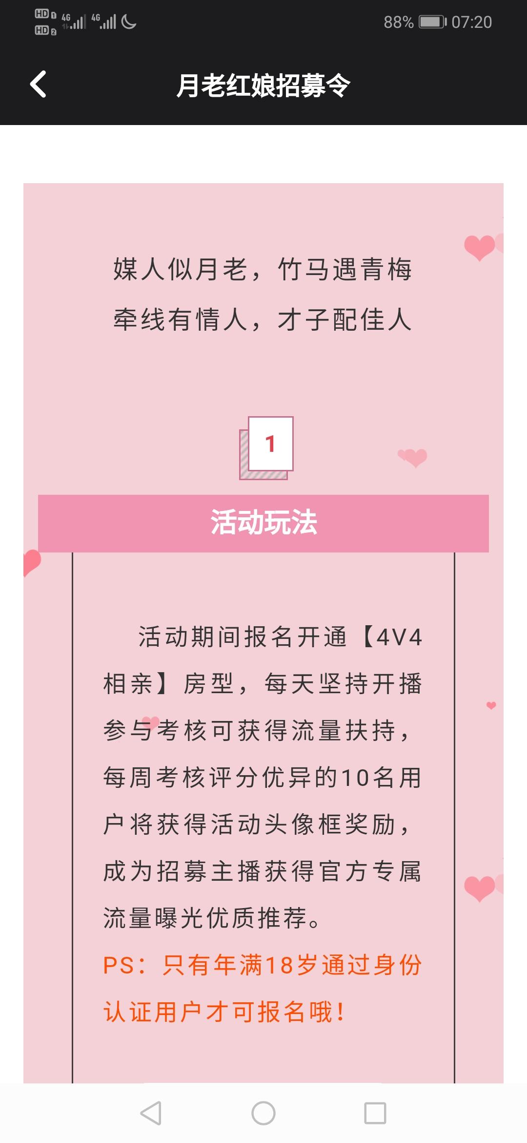 喜欢做媒吗?想给朋友介绍对象没有途径吗?想感受别人的爱情故事吗?快来参加活动~但是要年满18岁噢~而且表现优异的话奖励多多~快点迈出第一步~每天坚持开播平台会有对应的流量扶持(也就是你的房间会上推荐榜)每周考核评分表现优异的还可以有专属头像框拿噢🤔如果成为签约主播,那不用说了,排面呀👀