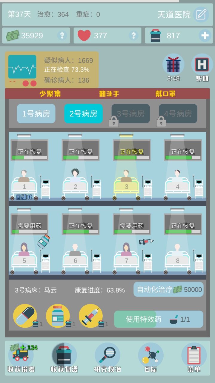 毕业留个念吧。手指差点报废了。解锁了所有病床,自动化,所有能升级的都升满了。