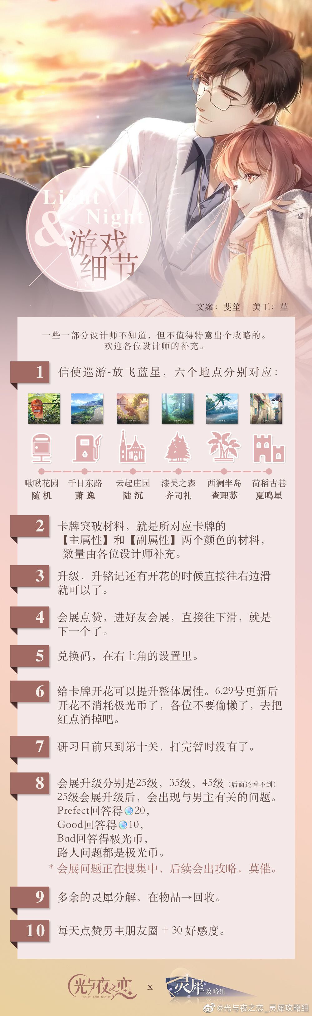 记录一些一部分设计师不知道,但不值得特意出个攻略的。欢迎各位设计师的补充。 1,放飞蓝星,六个地点分别对应,随机→萧逸→陆沉→齐司礼→查理苏→夏鸣星。都可以刷出1-5星的卡牌,但是卡牌人物跟地点有关,出现八个小时的五星卡牌。 2,卡牌突破材料,就是所对应卡牌的【主属性】和【副属性】两个颜色的材料,数量由各位设计师补充。 3,升级,升铭记还有开花的时候,直接往右边滑就可以了。 4,会展点赞,进好友会