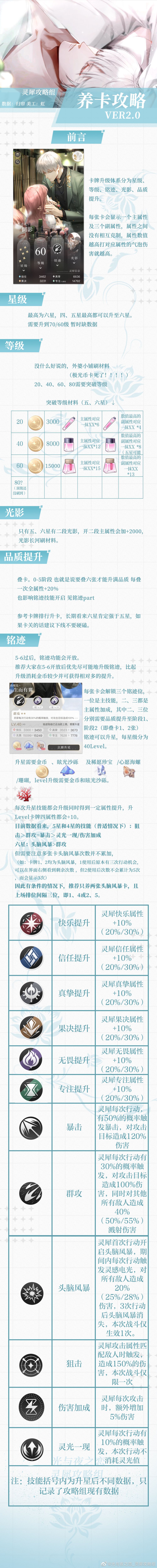 这游戏说到底是慢养成游戏,只是前期养的顺不顺决定了后面能走多远。 前期看了攻略说养6星和5星,对于氪金玩家来说,也分情况不是把五星和6星卡能氪到3个花瓣以上的还是老老实实养满花四星来过图,毕竟五星和6星的瘸腿属性大家也看到了。 不氪金的玩家,只能慢慢养,养高星卡没毛病,属性高了也能一击秒杀过图,撑到开启二段光影,主属性加成2000,很香,不过很慢。不要一卡就毛,不充钱你也想通高进度,你对比氪金玩家
