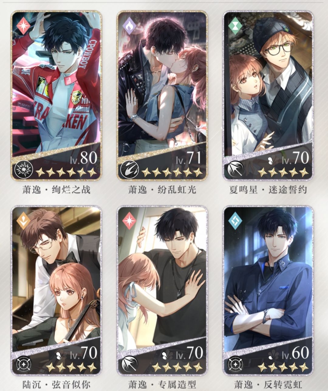 本人开服玩家,中间换过一次号,断断续续退了两百多天,二周年庆才回(可惜秃瓢辜负我),现在主线全过,材料副本全过,几乎零氪(一元礼包冲一下的那种),每天打打日常和活动就下线了,就讲讲一些养卡技巧吧!(个人摸索出来的) 第一,值得养的四星。这里“值得”是指四星群攻,每个男主都有一张,但是属性有重复。萧逸[夜雾沼泽],陆沉[醇香私语],夏鸣星[晴空之下],查里苏[火焰宣言],[齐思礼]光之缚。 第二,可