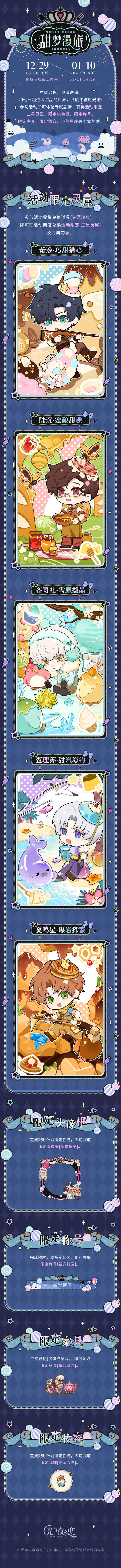 甜蜜启程,浪漫邂逅。★ 限时活动・甜梦漫旅开放时间:12月29日 05:00 - 1月10日 04:59兑换商店截止时间:1月11日 04:59活动说明:和他一起进入甜品的世界,共度甜蜜时光吧~参与活动即可体验专属剧情,获得活动限定二星灵犀、限定头像框、限定称号、限定家具、限定妆容、小熊星座等丰富奖励。▼活动限定灵犀参与活动收集兑换道具[许愿糖杖],即可在活动商店兑换活动限定[二星灵犀