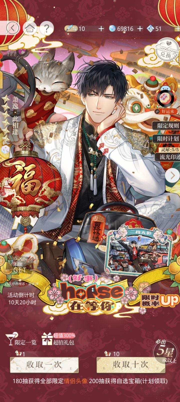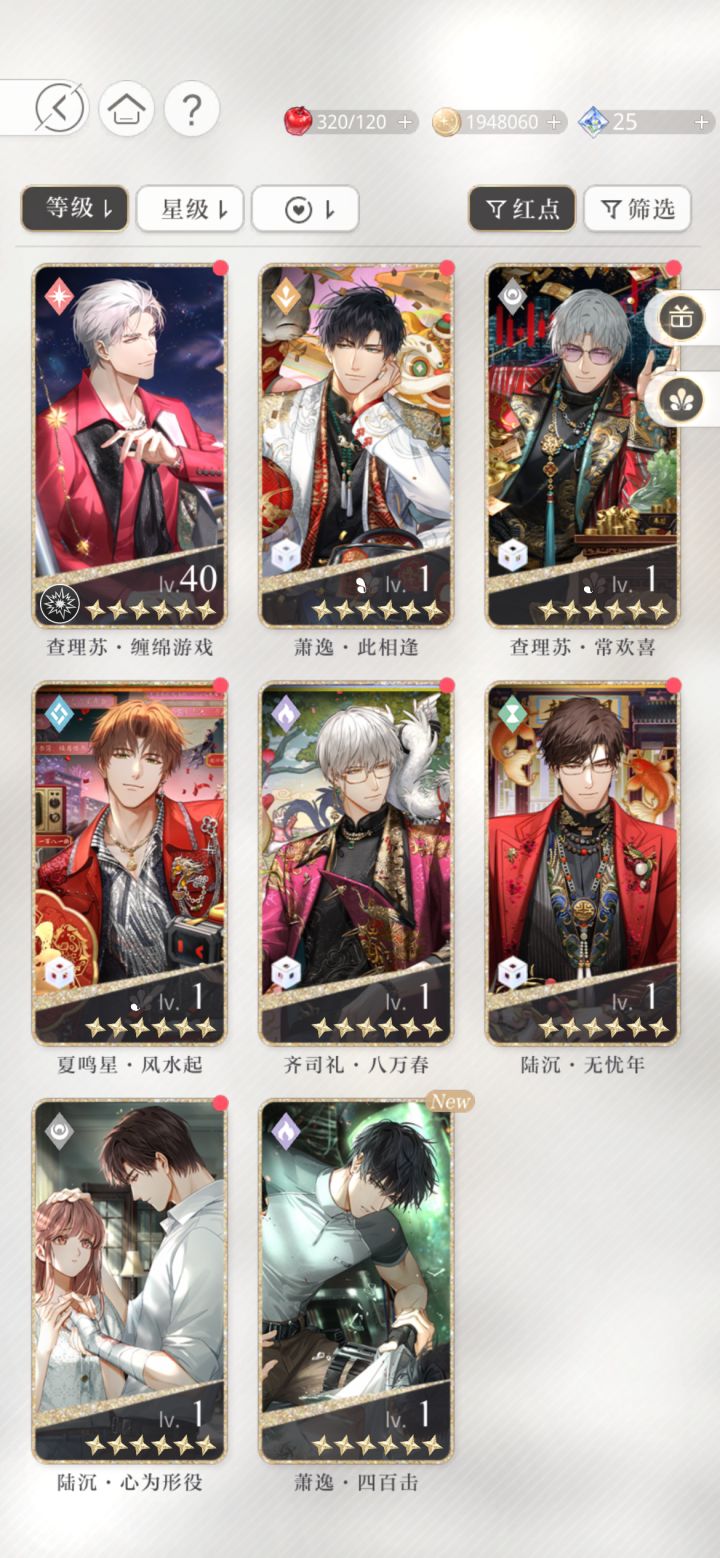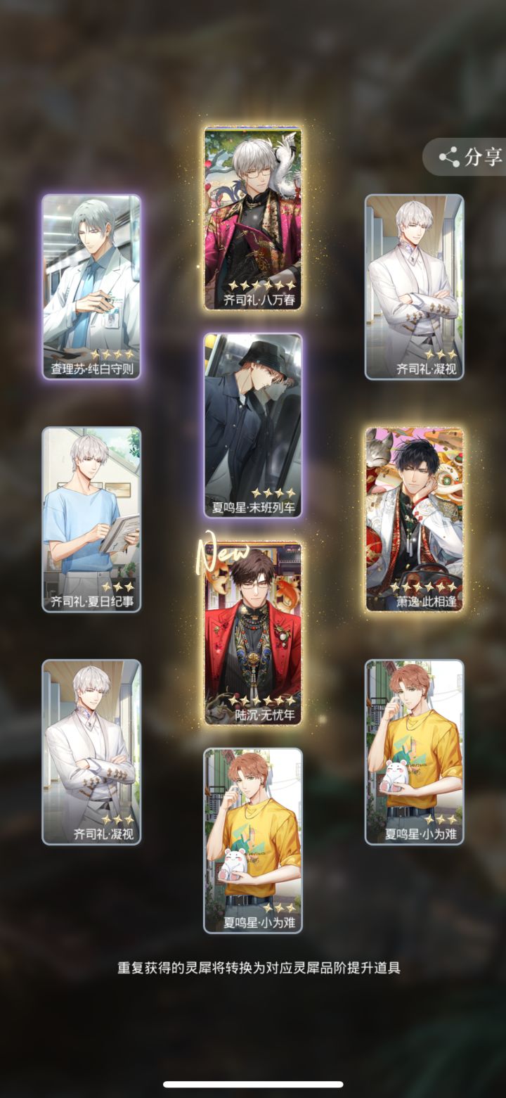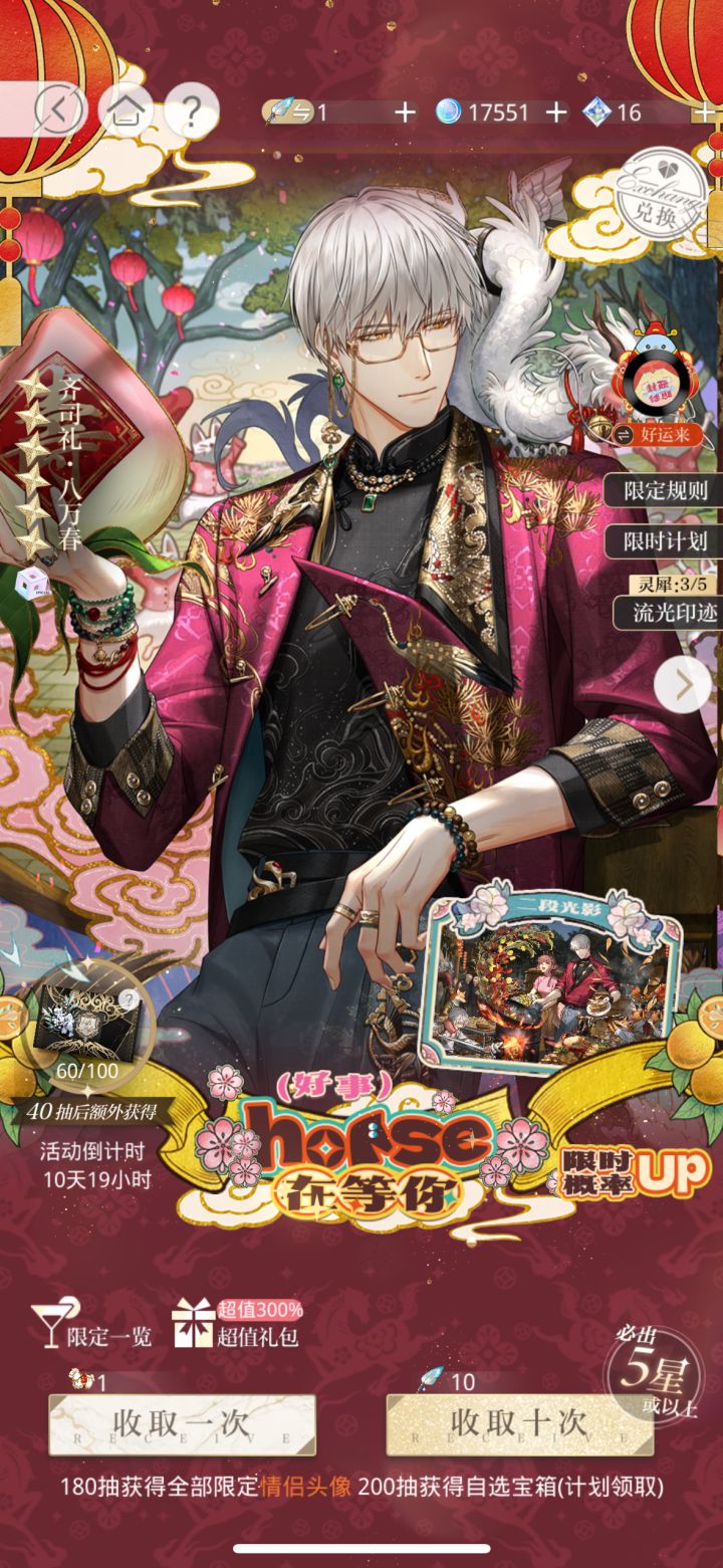 这可真是好运来 141抽 5张新年卡齐了 查理苏 陆沉叠一花 另外还歪出个齐司礼常驻卡ps.萧逸新年卡是靠兑换的#光与夜之恋