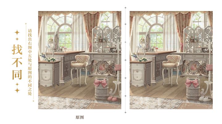 晨光漫过橱窗,传来轻柔絮语,未明的爱意藏进心坞。花栖梳梦,琴弦荡开涟漪,方寸宁谧处载满琳琅绮想。妆匣花镜前,似有什么是不一样的~透过时光镜影,来看看有什么不同吧!【参与方式】本期找不同活动共有五处不同。请设计师们在右图中圈出与原图的不同之处,并带图发送答案。【福利时间】感谢大家参与有奖互动,蓝星会从所有正确评论中抽出5位幸运设计师获得【陆沉正比徽章】*1【活动时间】2026年2月