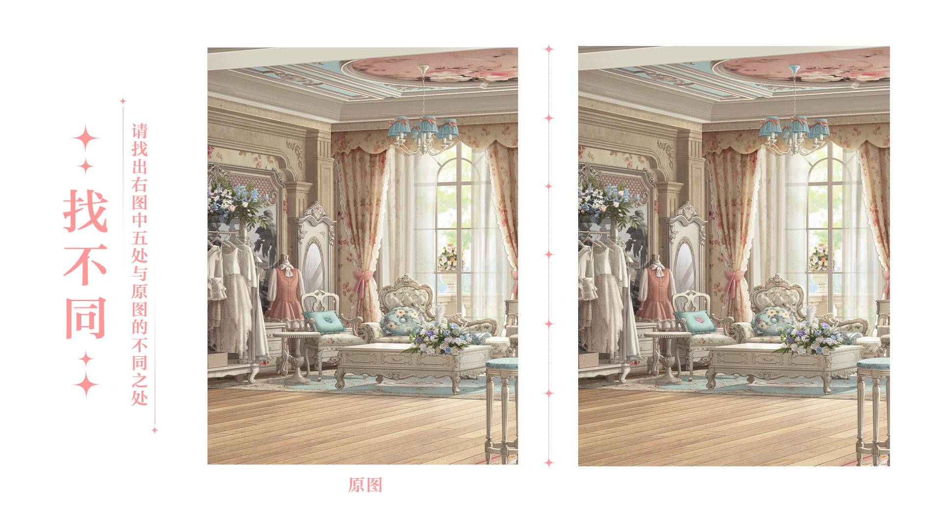 花月眠窗,星光坠海,往日回声编织进绮梦乐章。瑰色光影,风月蹁跹,凝成馥丽与浪漫交织的舞曲。绯裳织锦前,似有什么是不一样的~透过时光镜影,来看看有什么不同吧!【参与方式】本期找不同活动共有五处不同。请设计师们在右图中圈出与原图的不同之处,并带图发送答案。【福利时间】感谢大家参与有奖互动,蓝星会从所有正确评论中抽出5位幸运设计师获得【萧逸正比徽章】*1【活动时间】2026年1月10日