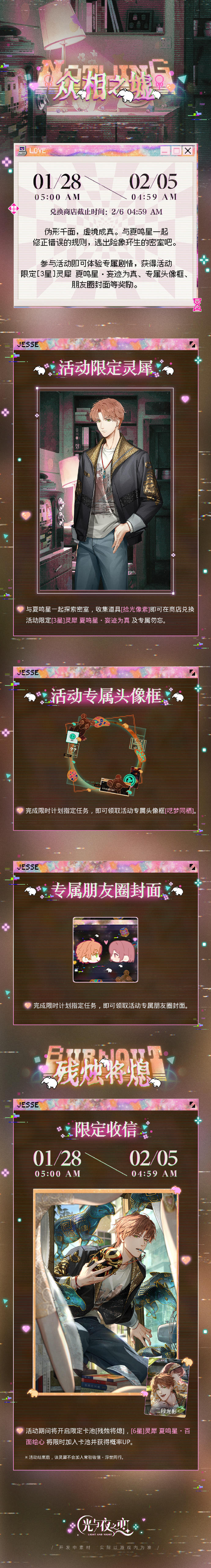伪形千面,虚境成真。★ 限时活动・众相之墟开放时间:1月28日 05:00 - 2月5日 04:59兑换商店截止时间:2月6日活动说明:与夏鸣星一起修正错误的规则,逃出险象环生的密室吧。参与活动即可体验专属剧情,获得活动限定[3星]灵犀 夏鸣星・妄迹为真、专属头像框、朋友圈封面等奖励。▼活动限定灵犀与夏鸣星一起探索密室,收集道具[拾光像素]即可在商店兑换活动限定[3星]灵犀 夏鸣星・妄