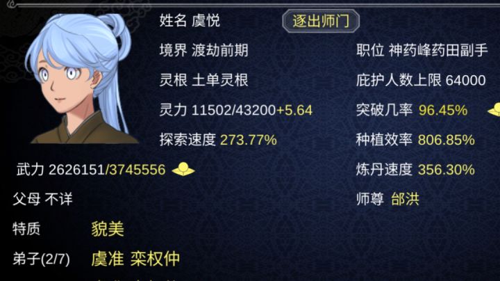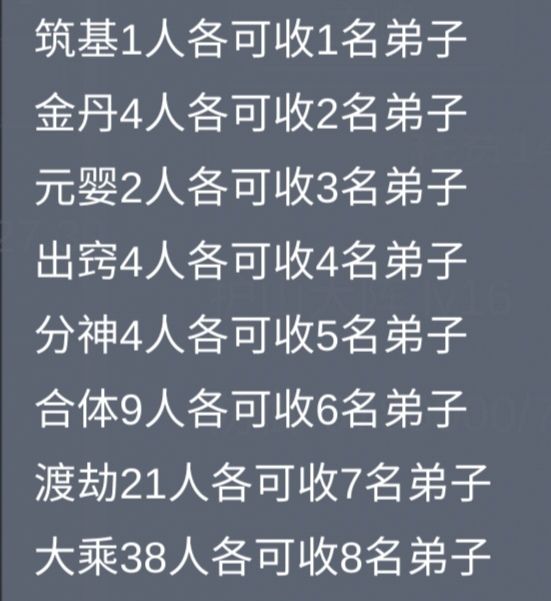 众所周知,一个宗门玩到中期、后期的时候,门派里大多是这个样子的【我这个档新开三千年还是种豌豆的,所以人少,看看比例就好】而由于大乘期飞升后不能再写功法,导致大乘期的无限叠加的各项能力为0,只能写渡劫期的功法,导致大乘期堆积的越来越多,很多人都很烦吧!没错,我也很烦!所以经过我的一番研究,终于研究出了一种方法,能让你们的大乘期飞升后可以写功法,让你们宗门内的大乘期受益,你们相信吗?不信?信