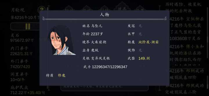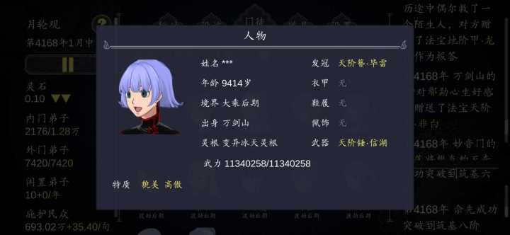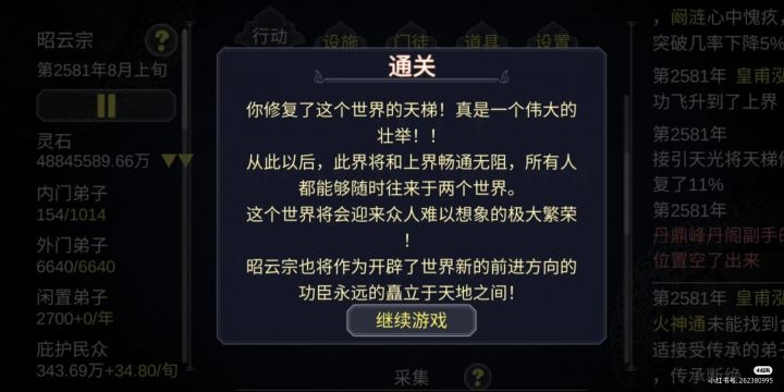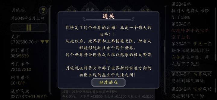 游戏目标:建立门派后飞升十人、完成修复天梯🌸🌸🌸🌸🌸🌸🌸🌸🌸🌸这个游戏起码要轮回一次,才能愉快的玩耍。⭐️第一回合:资质选择杂灵根、貌美,进入游戏。积累63功德后进入功德台轮回(杂灵根有较大几率变异成天灵根之类的优秀灵根,虽然我跳轮回台的时候没有成功变异…)⭐️第二回合:资质选择变异天灵根、貌美、气运之子、无垢灵体(也有许多攻略是轮回两次,开了三个周目,我嫌累,选择直接两个周目完