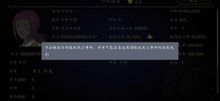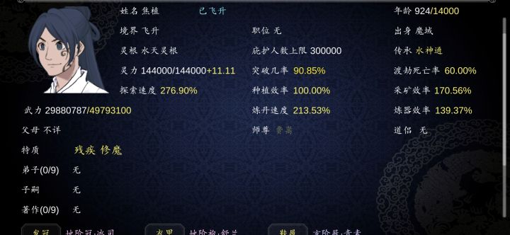开头附SL教学:游戏不会在线存档,只能在设置里面设置几年存档或者手动存档 ,当你存完档后游戏进度会保存,然后此时你退出游戏再重进,游戏进度会保存在存档的时候,比如你可以试试在设置里面设置每100年保存,然后你再手动保存,保存完后玩一小会你再不手动保存的前提下退出重新进入,就可以做到回档⑴ 灵根:游戏灵根一共有八种,稀有程度上自带1.8修炼速度的变异天灵根是游戏最稀有的灵根属性,前期非常难见(后