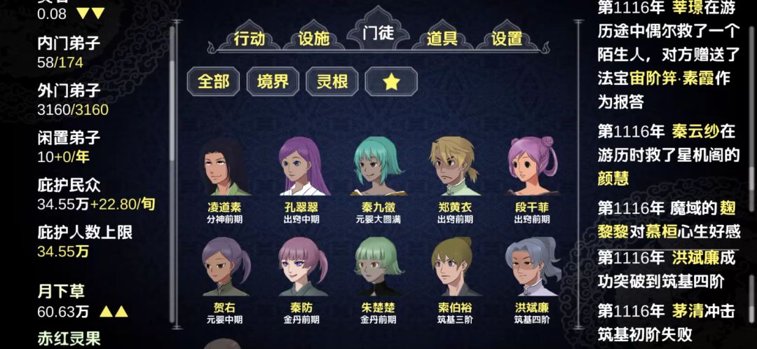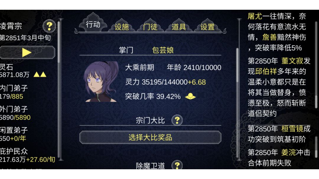 同题,都懒得换了,玩的一周目,变异天灵根也自生自灭,不管了,飞升给的装备有些真的很好,掌门带1500%战力加成的,你懂的,我这个要飞升了,都卸了,各位大佬看看,第一代掌门金丹就没了