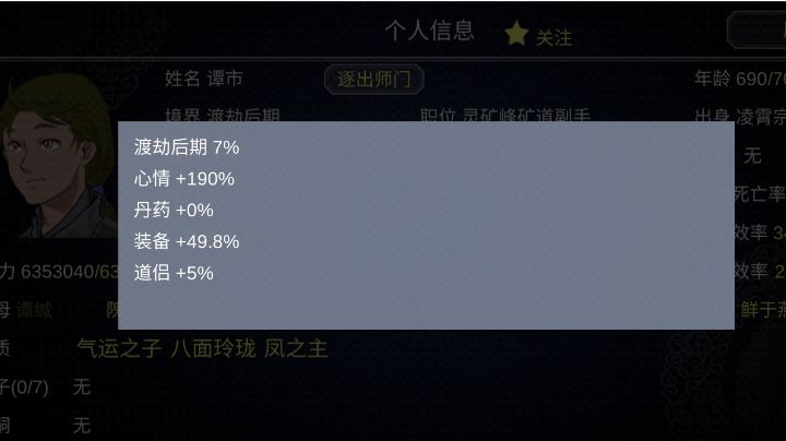 大家都知道,在结婚的时候 ,点击第二个人物的名字进去看资料的时候 ,点击父母丶师傅丶经历,再点击主角的名字 ,就可踢出师门他们大概率都会变成魔修。在结婚就有概率获得魔修弟子 我用的方法是。 踢出门派我用的办法是给它个装备在吧装备回收回来 ,踢出门派的选择就出来了。 关键来了,记得关注它,退出来的时候,记得点击行动,哪里一下在点击门徒,在到点关注,关键来了,随便点击一个门徒,在点出来的时候,按暂停。 这样做百分百魔修就新鲜出炉了。