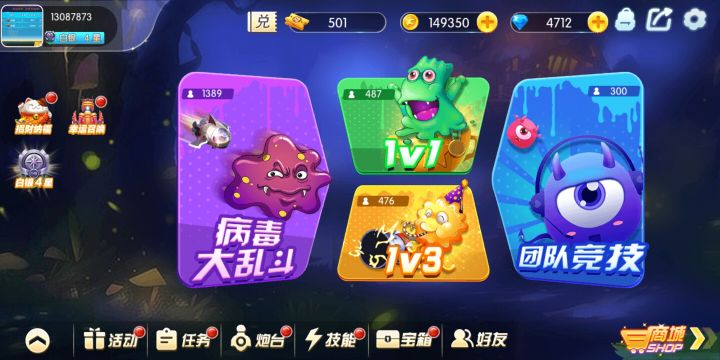 首先,病毒防御战分为三个模块:排位,娱乐以及团队模块。1.1V1,1V3为排位玩法。1V1为基础玩法,操作简单易上手。1V3,成长更迅速,且对手为三个人,需要更多的策略和操作。2.病毒大乱斗为娱乐玩法。产出特殊的宝箱以及兑换券。兑换券积累可兑换话费。共分为四个场次,场次越高,产出越高,当然挑战的难度也会更高;3.团队竞技。目前分为2V2,3V3,4V4,主要在于队友之间的配合,还有专属技能可