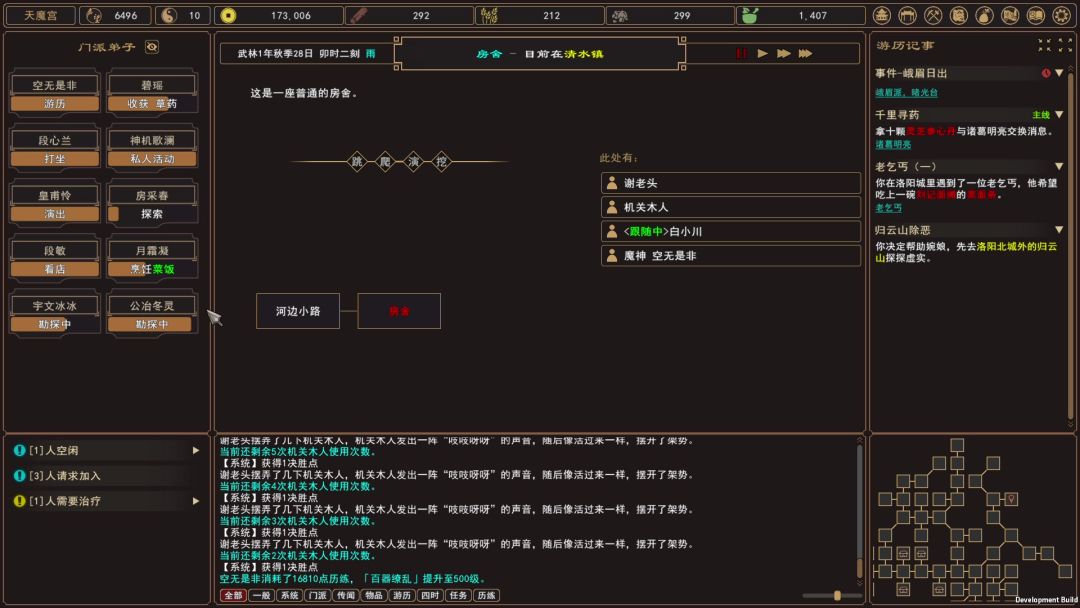 b.刚开局没什么钱和材料,开完门派荒地后,先别建厢房,工坊(基础材料加工厂),百宝阁(锄头铁毡工具之类),农田(拿种子种粮食药),大殿弄好,然后分派两个人分别