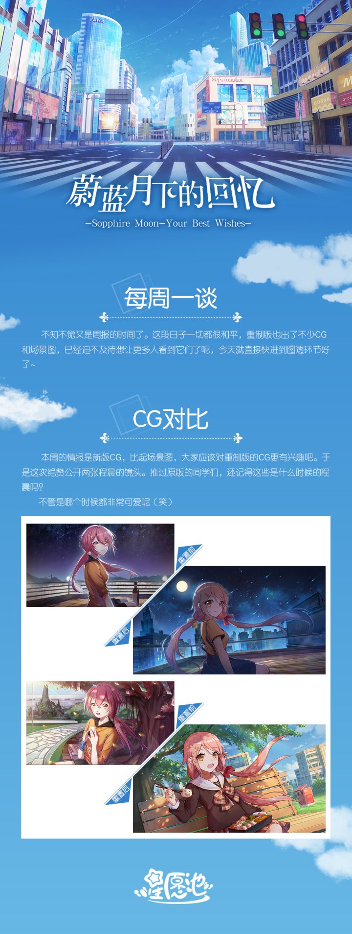 各位小伙伴大家好~作为本作元气担当的程晨,她的故事你还记得吗?撰稿人:主催刊期:2020.09.04====【周刊详情如下】====建议小伙伴可以关注我们“官方社区“已便了解后续更加全面的通知信息。星愿微博:←(点击前往)星愿Q群:731679522感谢小伙伴们一直的支持与鼓励 !往期剧场:蔚蓝月下的回忆蔚蓝月下的回忆_街区蔚蓝月下的回忆_家&远方蔚蓝月下的回忆_