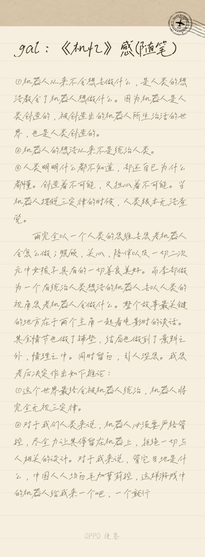 这是我玩的第一款galgame,玩了之后我感觉我的脑回路好差≥﹏≤,比如在得知女主吃了感冒药时,我还在疑惑机器人怎么会生病,根本没往那方面想(゜ロ゜) 不过后来又仔细想了想,才发现当我在看到女主时,是把她当成人类的;当我看不到女主时,是把她当成机器人的。而且我自己还没发现,导致一些细节我都没注意到,注意到了的也没法串起来。 不过也正是因为我没发现女主是人类,所以在面对最后一个选择时,想了想这
