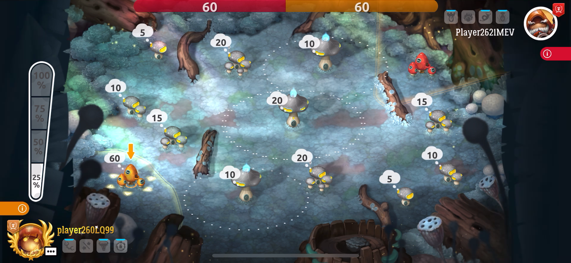 玩法核心是吸引地方兵力过来我们这边,让蛤蟆消耗它的兵力。然后我们通过不断争抢房子快速累计技能条,积攒满四技能后直接秒杀对方。 玩法要点 1前期拖动兵力直接选百分百,别太快就把兵力回防初试基地,这样对方可能不会继续出兵和你争夺。 2把初始兵力之外的兵尽量全放在一个房子里,这样电脑会感知到你其他地方兵力空虚从而发兵,这时我们死命何其争抢,就能达到快速累计技能条的目的。 3如果前期没引诱到电脑来疯狂争抢,电脑不发兵和你打持久战的话,直接退出重开就好了。