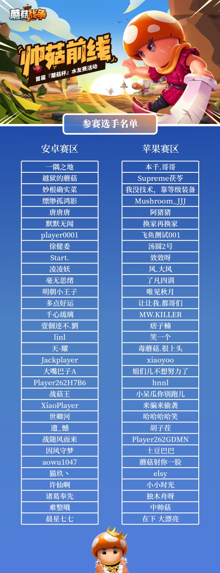 在本次水友赛中,成功入选了32位安卓赛区的首领,和32位苹果赛区的首领!大帅菇再一次的感受到了首领对于水友赛的热情,也希望各位参赛首领能够在比赛中打出自己想要的好成绩!以下就是这次成功入选的首领啦,我们的海选赛时间会在5月28日开始,提前做好热身运动赢下这场比赛吧!对阵表查看:参赛名单:请入选选手添加大帅菇(QQ:420168214),备注 XX赛区-游戏昵称,大帅菇会将选手拉入选手Q群
