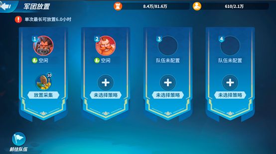 相信很多玩SLG的老玩家和我一样在接触到放置玩法有很多疑惑,有的可能都不知道这个游戏的放置玩法(军团放置,探索放置,主城放置和个人放置)具体是是什么意思,能够获得什么奖励,具体开启的条件是什么,放置的内容又是那些,所以简单写了篇攻略,希望大家能重新看待放置这个玩法,并将其好好利用起来,这对我们的前期发育有很大的帮助。 ————【军团放置】———— 一、开启条件:需要加入军团且军团创建了军团要塞,完