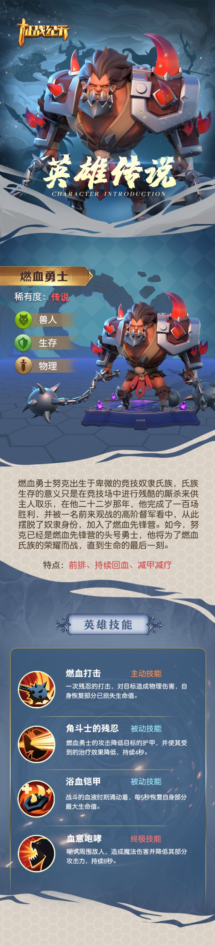 亲爱的领主大人们,大家好~我是你们的薇薇安 ٩(๑•̀ω•́๑)۶又是一周的开始,许久不见的英雄传说又来啦!今天给大家带来的是战斗中领主大人们常用作前排的兽人燃血勇士努克!顺便悄悄告诉领主大人们,这一年快结束啦,我们的沃普如斯大陆在等着领主们的回归哦~只要再稍稍耐心一点……今天的英雄传说到这里了祝领主大大们这周有个好心情~!创新挂机战争策略手游,就在征战纪元!加入征战纪元