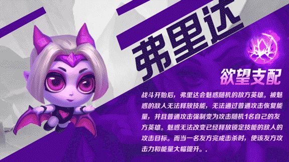 可爱又实用的新宠物来了,拥有超强的魅惑之力。 战斗开始后,弗里达会魅惑的敌方随机英雄。被魅惑的敌人无法释放技能,无法通过普通攻击恢复能量,并且普通攻击强制变为攻击随机1名友方英雄。魅惑无法改变已经释放锁定技能的敌人的攻击目标。而当一名本方英雄完成击杀时,则使本方能量最低的随机1名英雄攻击力和能量大幅提升。新宠物将于2月28日全球上线,敬请期待!