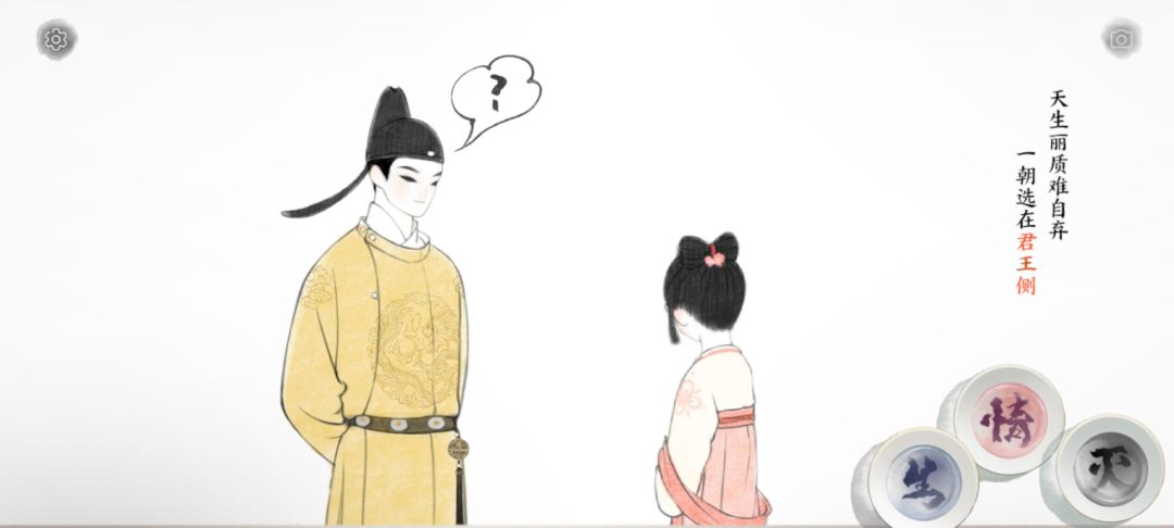 游戏中可使用“生、情、灭”三种墨水。“生”可以切换画卷中元素的状态,“情”可以在两个元素之间构建联系,而使用“灭”则可以移去选中的元素。采用简单的点击、拖拽即可完成以上操作,玩家需要做的是根据诗文描述进行判断操作,使画面与诗句呈现的情感一致,方能解锁关卡。